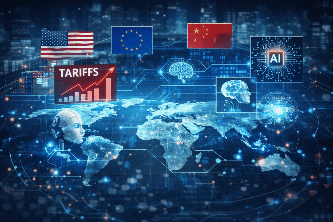 Se as tarifas reordenam comércio, a disputa tecnológica reorganiza capital. A corrida por liderança em Inteligência Artificial, chips, 5G e biotecnologia é descrita como fator central de 2025, com reflexos diretos sobre investimentos em talentos, pesquisa e infraestrutura.
