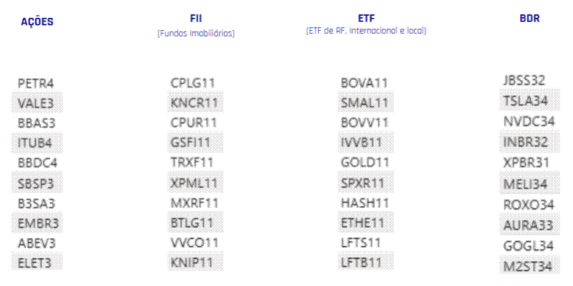 O levantamento contempla quatro instrumentos financeiros: ações, FIIs, ETFs e BDRs. Os líderes das respectivas categorias foram: XP LOG (CPLG11), Ishares Ibovespa (BOVA11) e JBS (JBSS32)