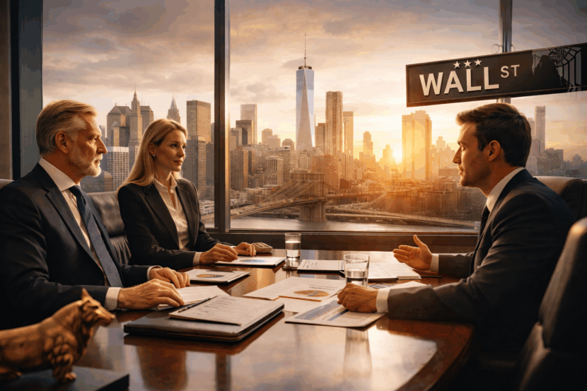 Imagem realista e profissional retratando o ambiente sofisticado dos family offices em Wall Street. Três executivos — dois homens e uma mulher — discutem estratégias financeiras em uma sala de reuniões de alto padrão, com ampla vista panorâmica para o skyline de Nova York, incluindo a One World Trade Center. Ao fundo, a famosa placa da Wall Street reforça o poder e influência desse tipo de gestão patrimonial. A mesa de reunião exibe documentos com gráficos, copos de água e notebooks, representando decisões financeiras de alto nível. A composição simboliza o crescimento e a centralização de poder dos family offices no mercado financeiro global, especialmente nos EUA.