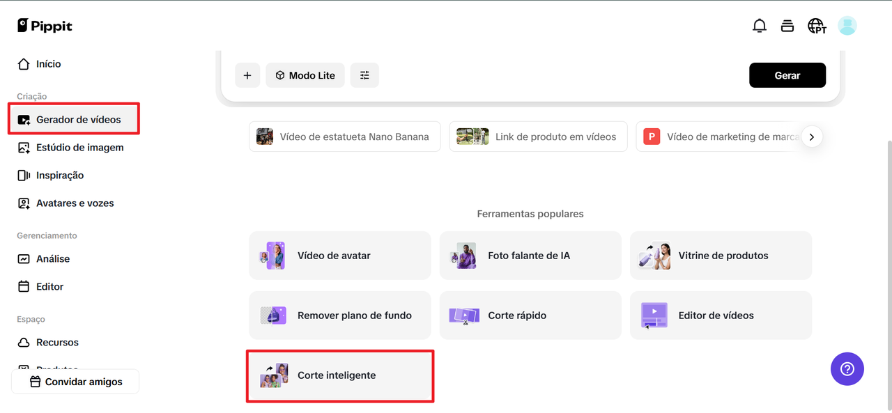 Clique no botão “Experimente grátis” no Pippit para se cadastrar. Seja por e-mail, login social ou outra forma, o fluxo é simples como seda. Assim que entrar, você terá à disposição todo um kit de ferramentas de edição, feito para economizar seu tempo. Vá até a aba “Gerador de vídeos” dentro da interface do Pippit e selecione “Corte inteligente”.