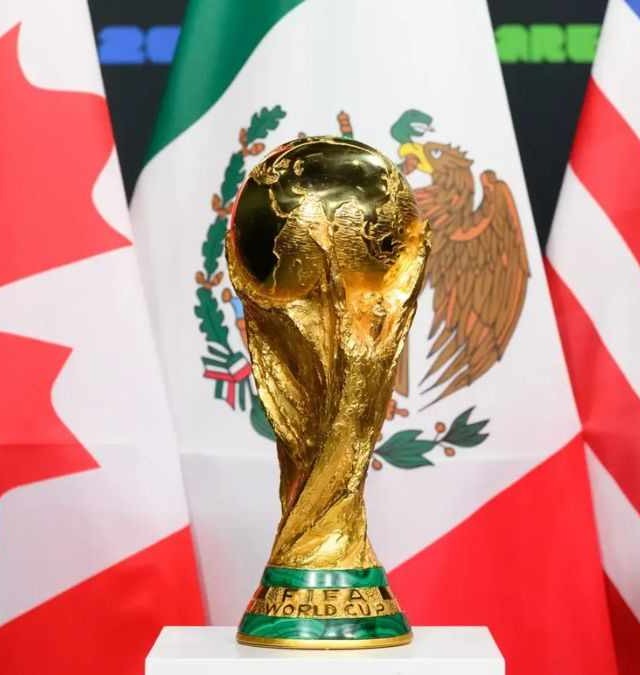 Taça da copa do mundo na frente das bandeiras de México, Canadá, e EUA