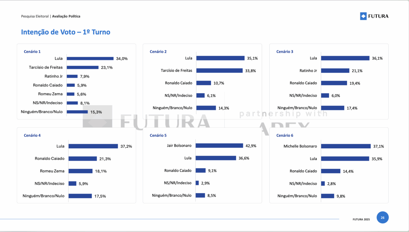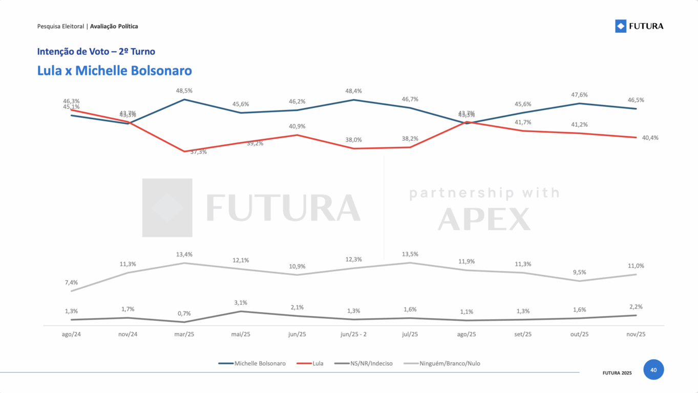 De acordo com o levantamento, Lula (PT) segue na liderança dos cenários testados, enquanto Michelle Bolsonaro aparece como a única integrante da família Bolsonaro com competitividade real. Os dados estão no relatório de novembro de dois mil e vinte e cinco.